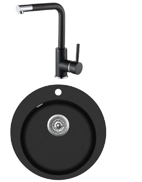 Einbau Granitspüle Gurari SRR 100 - 601 W, Schwarz + 5553-601 Messing-Armatur, Schwenkbereich 360°